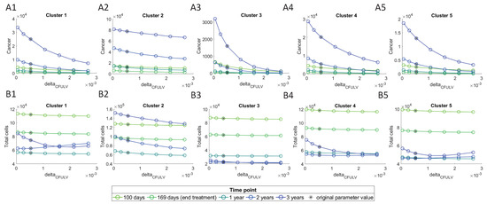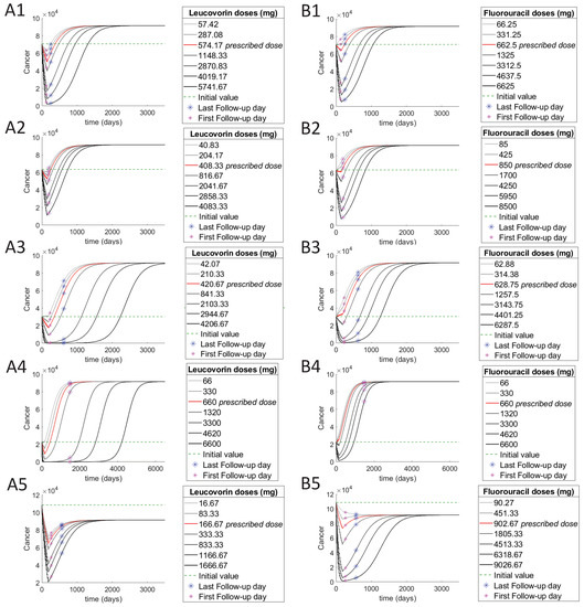 Cancer cells dynamics with varying doses for individual patients in each cluster. (A) are obtained by varying the Leucovorin dose while keeping the 5-FU dose constant. (B) are obtained by varying 5-FU and keeping the Leucovorin dose at zero. (A1,B1), (A2,B2), (A3,B3), and (A5,B5) respectively show the results of a tumor-free patient in the clusters 1, 2, 3 and 5. Note, the patient in cluster 3 (A3,B3) is tumor-free at the first follow-up day, but is with-tumor at the last follow-up day. (A4,B4) show the results of a with-tumor patient in the cluster 5.