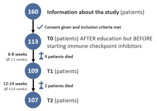 Inclusion criteria were German-speaking women and men of full age who had been scheduled for treatment with immune checkpoint inhibitors (ICI) for metastatic melanoma (AJCC-Stage III/IV). Exclusion criteria were severe problems with the German language, severe psychological or neurological symptoms (e.g., psychosis, dementia), or lack of consent. The study was performed between December 2017 and February 2019. A total of 160 patients were informed about the study. Of these, 39 patients declined to participate. Thus, 121 patients decided to participate and provided written informed consent. Eight patients did not complete the first or second follow-up questionnaire, completed it only partially or too late, or decided against further participation in the study. The basis of the statistical evaluation was, therefore, 113 patients at T0.