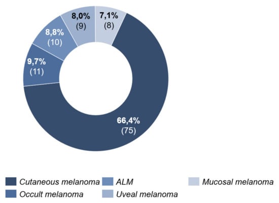 Cutaneous melanoma was the most common type (66.4%, n = 75) (Figure 2).