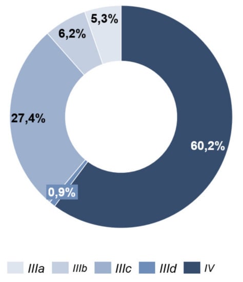 At the time of the initial survey (T0), 68 patients (60.2%) were classified as tumor stage IV and 45 patients (39.8%) as stage III (Figure 3).