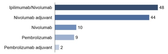 Combined systemic therapy with ipilimumab and nivolumab received 48 patients (42.5%). Ten patients (8.8%) started monotherapy with PD-1 antibody nivolumab, nine patients (8.0%) with PD-1 antibody pembrolizumab. Among the total cohort of 113 patients, 44 patients (38.9%) had nivolumab and two patients (1.8%) pembrolizumab in an adjuvant setting (Figure 4).