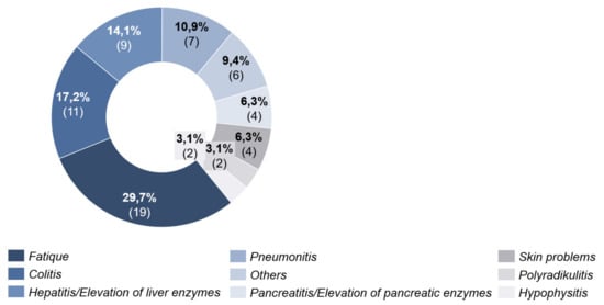 In 65.2% (n = 30) of the patients with combined ICI, side effects occurred up to time T2. These appeared on average 33 days (4–63 days, SD = 18.14) after the start of systemic therapy. Most frequently (29.7%), fatigue was documented. The second most frequently documented side effect was colitis with 17.2% (Figure 5).