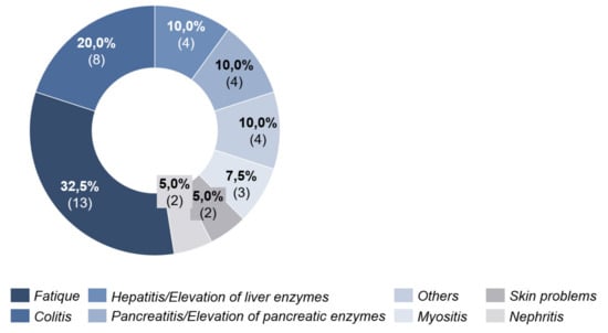 Under PD-1 antibody therapy, 27.0% (n = 17) of patients experienced side effects. These were seen after an average of 39 days (20–89 days, SD = 20.34) after initiation of ICI. Here, fatigue was also the most frequent cause with 32.5%. Colitis was in second place with 20.0% (Figure 6).