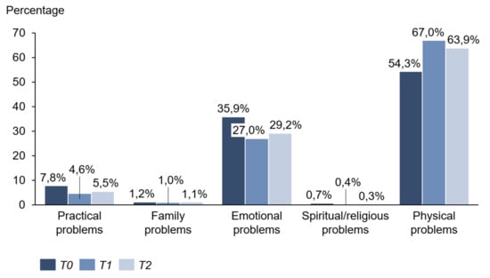 Concerning the related problem list, physical problems were the priority at all measurement points. They reached their maximum value at time T1 (T0: 54.3%; T1: 67.0%; T2: 63.9%). Exhaustion, skin problems, sleep disorders, and pain were most frequently mentioned. Emotional problems came second to problem areas and were highest at the beginning of immunotherapy (T0: 35.9%; T1: 27.0%; T2: 29.2%). Above all, worries and fears occurred in half of the patients interviewed. Practical problems took third place. Family problems and religious issues were extremely rare (Figure 7 and Table 1).
