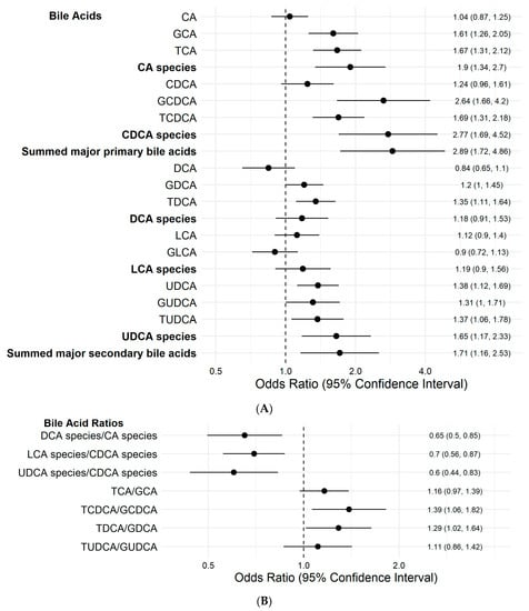 | Major Bile Acid Species a | Odds Ratio (95% CI) b by Bile Acid in Tertile | |||