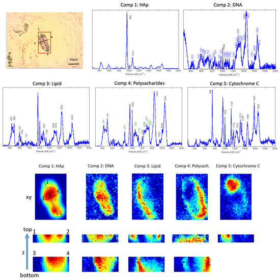 Finally, Component 5 presents bands (749, 1002, 1128, 1174, 1232, 1312, 1339, 1449, 1587 and 1658 cm−1) that can be assigned to cytochrome C [42] (Figure 2). Thanks to the abundance maps in x-y and z we can confirm that this molecular component is located inside the HAp calcification.
