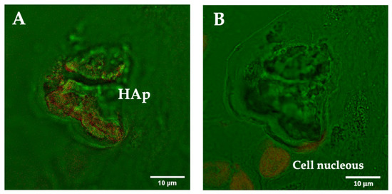 Confocal microscopy images of a breast cancer tissue section containing a HAp calcification at different depths: (A) image focused on the plane of the calcification, and (B) image focused on the plane of the surrounding cells in the tissue. DNA staining was performed with DAPI. Bright field (green) and DAPI (red). DAPI staining indicates the presence of DNA inside HAp calcifications and enables the visualization of the nucleus of the surrounding cells.