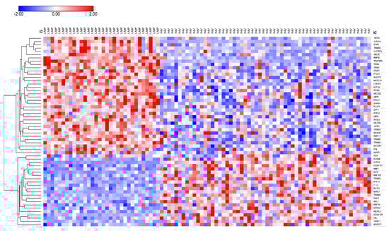| RAD51 * | 31.12 ± 2.36 | 93.94 ± 6.44 | 50.158 | 3.32 × 10−10 |