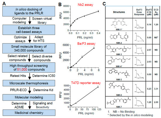 Strategy for high throughput screening (HTS) and molecular characterization of small molecule inhibitors (SMIs) of prolactin (PRL) signaling. (A) Steps of selecting 51,000 compounds, HTS screening, and validation. (B) Dose–response curves of 3 cell-based assays used sequentially. Bars are means ± SEM (n = 3–5). Cells in each assay were incubated with PRL alone, compound alone, or compound + PRL. RFU = relative fluorescent units. (C) Characteristics of the 7 SMIs with the best IC50 values in the Ba/F3 assay. Shown are the chemical structures, dose–response inhibition curves against PRL and calculated IC50s in the Ba/F3, and dissociation constants (Kd) to the extracellular domain (ECD) of the PRLR in the microscale thermophoresis (MST) assay.