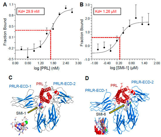 Binding curves of hPRL (A) and SMI-1 (B) to PRLR-ECD, as determined by microscale thermophoresis. The dissociation constants (Kd) were calculated using the Hill equation method. Error bars represent SEM of 3 measurements. Panels (C,D) show docking simulations of SMI-1 and SMI-6, respectively, to dimerize ECD (blue) of the PRLR bound to PRL (red). Insets show binding details of the SMIs.