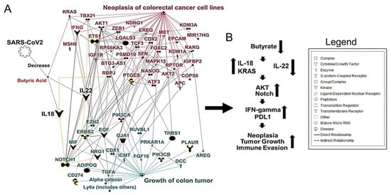 SARS-CoV-2 Infection: Implications for CRC. (A) Ingenuity Pathway Analysis (IPA)-generated network map showing known connections among butyrate, IL-18, IL-22, and CRC in IPA. (B) Simplified schematic of (A), showing gut dysbiosis caused by a decrease in butyrate-producing bacteria and a subsequent lack of IL-22 production, which allows bacterial metabolites to enter the circulatory system leading to an increase in inflammatory markers, thus increasing colitis-associated colon cancer.