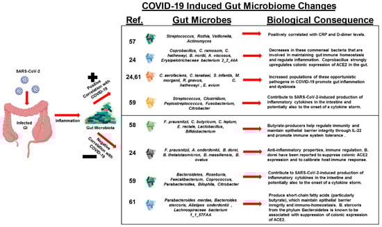 Schematic showing changes in the gut microbiome caused by SARS-CoV-2 infection, their correlation with COVID-19 severity, and the biological consequences of these changes [24,57,58,59,61].