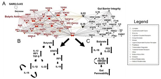 SARS-CoV-2 Infection, Butyrate, and Gut Barrier Integrity. (A) Ingenuity Pathway Analysis (IPA) (Qiagen)-generated network map showing known connections among butyrate, IL-18, IL-22, and gut barrier integrity. (B,C) A reduction in butyrate-producing bacteria disrupts gut epithelial barrier integrity via IL-22 signaling and promotes inflammatory signaling through IL-18.