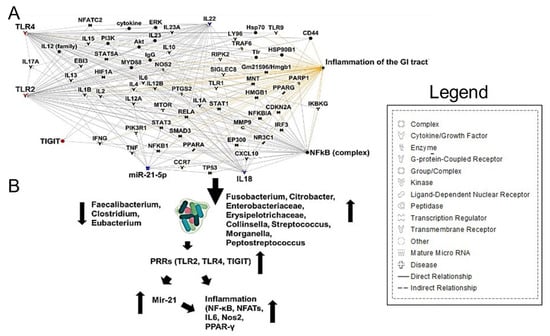 Fusobacterium nucleatum Bacteremia Causes Gut inflammation. (A) Ingenuity Pathway Analysis (IPA)-generated network map showing pathway responsible for the F. nucleatum induction of inflammation. (B) F. nucleatum interacts with Toll-like receptors 2 and 4, resulting in increased miRNA-21 expression, which promotes NF-kB induction and contributes to the induction of inflammation.