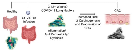 A complete understanding of the complex factors leading to dysbiosis has not yet materialized. It is critically important that we understand how infection with SARS-CoV-2 will impact the gut microbiota and CRC progression. The impact of SARS-CoV-2 on gut dysbiosis and the gut microbiota may be long-lasting, thus underscoring the importance of restoring a competent microbiome to resist the development of GI diseases, such as irritable bowel syndrome, allergic colitis, recurrent Clostridioides difficile infection, and CRC [87,88].