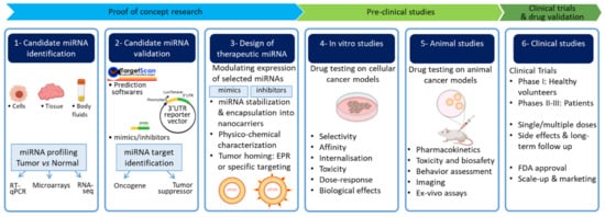 Translating miRNA biology from bench to bedside in cancer. As for the classical drug discovery workflow, development of miRNA therapeutics consists of 3 main levels: proof of concept research, preclinical studies, and clinical trials. (1) Identification of candidate miRNAs for therapy. MiRNA expression is quantified in tissue, cells, or body fluids of healthy and tumor specimens (RT-qPCR: Reverse Transcription-quantitative PCR; RNA-Seq: RNA sequencing). (2) Potential targets of differentially expressed miRNAs can be identified using target prediction softwares and validated in reporter gene assays vectors using target transcript 3′-UTR cloned downstream of luciferase reporter and miRNA mimics/inhibitors. (3) Design of therapeutic miRNA requires stabilization and encapsulation of miRNAs in well characterized carriers. (4) Evaluation of the effects of miRNA-loaded nanocarriers on several biological processes in cancer cell models is a pre-requisite for the development of therapeutic protocols in vivo. (5) Therapeutic miRNA candidates are tested in animal cancer models alongside animal behavior and recovery before the evaluation of the antitumor effects. (6) Initiation of clinical trials requires a careful assessment of efficacy and toxicity in pre-clinical studies. Doses and side effects are particularly monitored for FDA approval and treatment scale-up.
