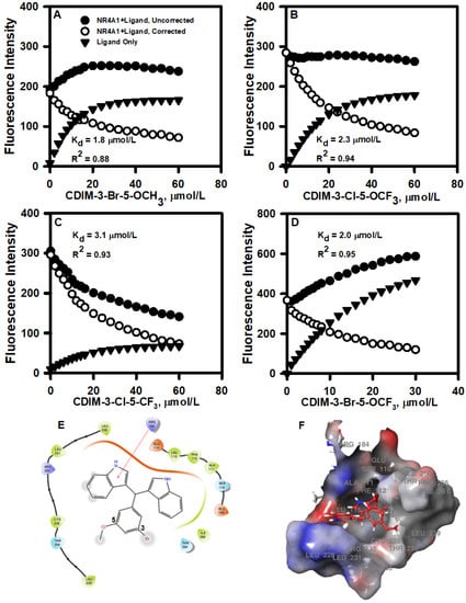 3,5-Disubstituted CDIMs as NR4A1 ligands: Direct binding of the 3-Br-5-OCH3 (A), 3-Cl-5- OCF3 (B), 3-Cl-5- CF3 (C), and 3-Br-5- OCF3 (D). Phenyl-substituted CDIM compounds with the ligand-binding domain (LBD) of NR4A1 was determined by the fluorescent quenching of a Trp residue in the LBD (19). Example of 3-Br-5-OCH3 interactions with amino acid side chains (E) and the binding pocket of NR4A1 (F).