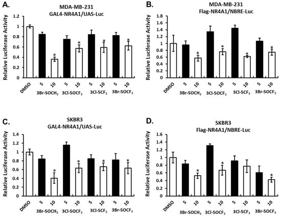 The effects of these NR4A1 ligands and NR4A1-dependent transactivation were determined in MDA-MB-231 breast cancer cells transfected with constructs containing a yeast GAL4-NR4A1 chimera and a UAS-luc reporter gene (containing five GAL4 response elements) (Figure 2A) and an NBRE-luc construct containing a monomeric NBRE site that binds monomeric NR4A (Figure 2B). Treatment with the 3,5-disubstitued analogs decreased transactivation in MDA-MB-231 cells. A similar response was observed in SKBR3 cells transfected with GAL4-NR4A1/UAS-luc (Figure 2C) or NBRE-luc (Figure 2D) constructs and treated with the 3,5-disubstituted analogs. These results show that the 3,5-disubstituted phenyl analogs act as NR4A1 antagonists in breast cancer cells, as previously observed with other 3,5-disubstituted phenyl bis-indoles containing the 4-hydroxyl group [20,21].