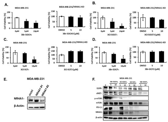 Effects of 3,5-disubstituted phenyl CDIM analogs on MDA-MB-231 cell viability and NR4A1-regulated gene products. MDA-MB-231 cells were treated with 3-Br-5-OCH3 (A), 3-Cl-5- OCF3 (B), 3-Cl-5- CF3 (C), and 3-Br-5- OCF3 (D) for 24 h and effects on cell proliferation were determined in cells expressing NR4A1 and after NR4A1 knockdown, as outlined in the Materials and Methods section (E), The uncropped Western blots have been shown in Figure S1. Cells were transfected with oligonucleotides targeting NR4A1 and after 72 h whole cell lysate were analyzed by western blots (F). (NR4A1 #2 used above) Cell lysates from MDA-MB-231 cells were treated with the CDIM compounds and analyzed by western blots to determine effects on NR4A1-regulated gene products. Results (A–D) are given as means ± SD for at least three replicate determinations for each treatment group, and significant (p < 0.05) inhibition is indicated (*).