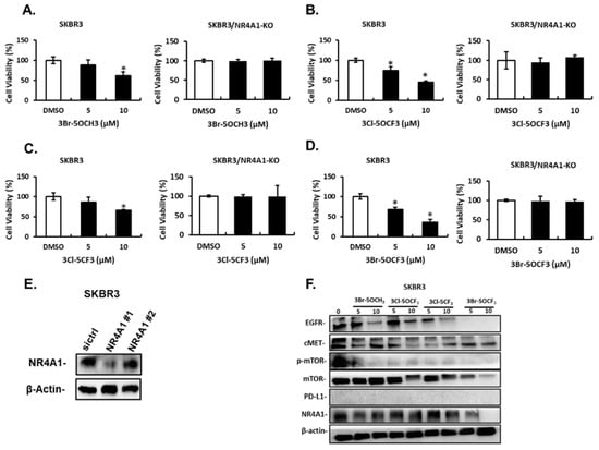 Effects of 3,5-disubstituted phenyl CDIM analogs on SKBR3 cell viability and NR4A1-regulated gene products. SKBR3 cells were treated with 3-Br-5-OCH3 (A), 3-Cl-5- OCF3 (B), 3-Cl-5- CF3 (C), and 3-Br-5- OCF3 (D) for 24 h and effects on cell proliferation were determined in cells expressing NR4A1 and after the NR4A1 knockdown, as outlined in the Materials and Methods section (E). Cells were transfected with oligonucleotides targeting NR4A1, and after 72 h whole cell lysate were analyzed by western blots (F). (NR4A1 #1 used above) Cell lysates from SKBR3 cells were treated with the CDIM compounds and analyzed by western blots to determine effects on NR4A1-regulated gene products. Results (A–D) are given as means ± SD for at least three replicate determinations for each treatment group, and significant (p < 0.05) inhibition is indicated (*).