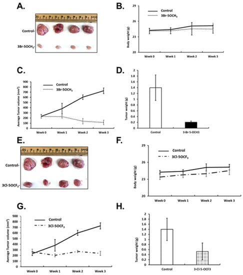 Inhibition of tumor growth by 3-Br-5-OCH3 and 3-Cl-5-OCF3 phenyl-substituted CDIMs. Athymic nude mice were injected with MDA-MB-231 cells orthotopically and administered corn oil or 3-Br-5-OCH3 (1 mg/kg) daily for 21 days and effects on tumor volume (A), body weight (B), tumor growth (C), and weight (D) were determined, as outlined in the Materials and Methods section. The same protocol was used for 3-Cl-5-OCF3 (1 mg/kg/d) phenyl-substituted CDIM and effects on tumor volume (E), body weight (F), tumor growth (G), and weight (H) were determined.