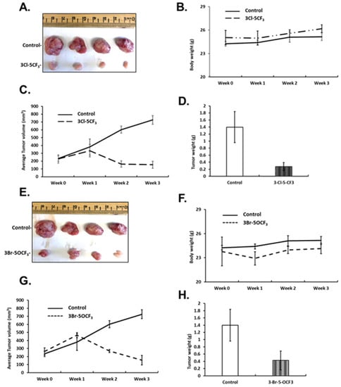 Inhibition of tumor growth by 3-Cl-5-CF3 and 3-Br-5-OCF3 phenyl-substituted CDIMs. Athymic nude mice were injected with MDA-MB-231 cells orthotopically and administered corn oil or 3-Cl-5-CF3 (1 mg/kg) daily for 21 days. Effects on tumor volume (A), body weight (B), tumor growth (C), and weight (D) were determined, as outlined in the Materials and Methods section. The same protocol was used for 3-Br-5-OCF3 (1 mg/kg/d) phenyl-substituted CDIM and effects on tumor volume (E), body weight (F), tumor growth (G), and weight (H) were determined.