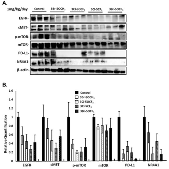 3-Cl-5-CF3 (1 mg/kg/d) also decreased tumor size (Figure 6A), did not affect body weights (Figure 6B), and decreased tumor volumes (Figure 6C) and tumor weights (Figure 6D). Similar results were observed in mice treated with 3-Br-5-OCF3 where tumor size was unchanged (Figure 6E), body weights were not affected (Figure 6F), and tumor volumes (Figure 6G) and weights (Figure 6H) were decreased. These results clearly demonstrate the potency of the 3,5-disubstituted phenyl bis-indole derivatives as tumor growth inhibitors, which are significantly more potent than CDIM8 and other 4-substituted phenyl analogs. We also observed that in tumor lysates from the treated mice that the NR4A1-regulated gene products EGFR, cMET, PD-L1, and phosphorylated mTOR were decreased (Figure 7A,B) and that these in vivo results complement the in vitro studies in MDA-MB-231 cells (Figure 3).