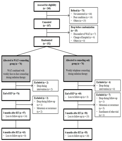 Of the 152 patients, 143 (94.1%; counseling-only group, n = 69; WAT+counseling, n = 74), 107 (70.4%; counseling-only group, n = 50; WAT+counseling, n = 57), and 118 (77.6%; counseling-only group, n = 55; WAT+counseling, n = 63) patients completed the survey at the end of RT and 3 and 6 months after RT, respectively. We excluded nine patients who were loss to follow-up and whose GAPQ were not available. The final analysis for the primary outcome included 143 patients (Figure 1).