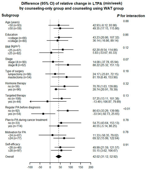 The range of step data for the WAT+counseling group during the intervention was 1279~32,404 steps per day. In the subgroup analysis, we found that the association was stronger in the patients who did not perform regular PA before diagnosis than in the patients who did (p for interaction, <0.01; Figure 2).