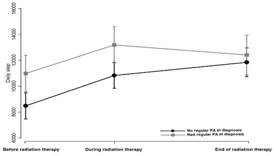 Among the WAT+counseling group, the mean average daily step count was 9351.7, which increased to 11,592.2 during RT and to 12,240.1 after RT (Table 3). While the mean average daily step count (SD) before RT (before randomization) between the patients who did not perform (8336.6, SD = 3326.1) and who performed regular PA (11,012.4, SD = 5025.3) before diagnosis was significantly different (p = 0.013), it was similar at the end of the intervention [11,930.9 (502.6) and 12,766.3 (917.0) for the patients who did not perform and who performed PA, respectively] (p = 0.39; Figure 3).
