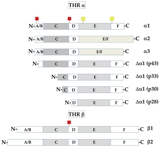 Schematic representation of the domain structure of THRα and THRβ. The full-length TH receptors contain: (i) an N-terminal A/B domain, involved in transcription transactivation; (ii) a DNA-binding domain (C), which recognizes and binds the TH-response elements (TREs), and is also involved in receptor dimerization; (iii) a hinge domain (D) and (iv) an E/F domain that can be involved in binding the hormone, as well as in protein–protein interactions. The full-length THRα1 contains two nuclear localization signals (NLS: red squares) and two atypical mitochondrial import sequences (MIS: yellow squares). The THRα1 shorter forms, which derive from internal AUG translational usage, lack one or both NLS; in these proteins, the localizing effect of the mitochondrial signals is prevalent. THRβ contains only one NLS (red square) in the D domain [66].