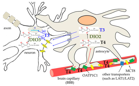 Trafficking of THs to the brain across the blood–brain barrier (BBB). T4 is the main hormone crossing the BBB. It then enters astrocytes through both OATP1C1 (green rectangles) and MCT8 (yellow ovals) transporters, as well as through other transporters (blue rectangles), such as LAT1/LAT2. T3 is much less represented in the blood; a few molecules can perhaps reach astrocytes through MCT8. Once in the astrocytes, T4 is converted to T3 by deiodinase 2 (DIO2). T3 can then exit astrocytes through transporters that are not well characterized (grey rectangles) and enter neurons through MCT8. In the neuron, T3 can enter the nucleus and bind its nuclear receptors (pathway a) or it can be catabolized by DIO3 (pathway b).