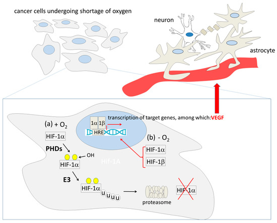 The proliferation of glioma cells consumes oxygen, thus generating hypoxia and variable degrees of necrosis [268,269,270]. In turn, oxygen shortage inhibits prolyl hydroxylase domain proteins (PHDs), which use molecular oxygen to hydroxylate their substrates [271], including the α subunit of the hypoxia-inducible transcription factor-1 (HIF-1α). When hydroxylated, HIF-1α is poly-ubiquitinated by the von Hippel–Lindau tumor suppressor protein (pVHL) and degraded by the proteasome [271]. When hydroxylation is inhibited because of hypoxia, HIF-1α is no longer ubiquitinated and degraded; thus, it can heterodimerize with HIF-1β. The dimer enters the nucleus, binds to the hypoxia-response elements (HREs) present in the promoters of hypoxia-regulated genes, and activates them [271,272] (Figure 3). Among the activated genes, some encode angiogenic factors, such as vascular endothelial growth factor (VEGF) and fibroblast growth factor-2 (FGF-2), which stimulate the endothelial cells (ECs) to release proteases that degrade various components of the extracellular matrix, thus allowing ECs themselves to migrate, proliferate, and differentiate, forming new vessels [273].