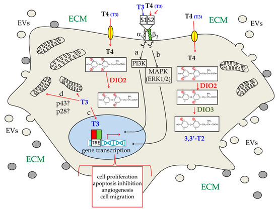 Schematic view of the different hypothetical pathways triggered by THs in a generic brain cancer cell. THs can enter the cells through membrane transporters (yellow ovals), such as MCT8 and OATP1C1. They can also bind to plasma membrane receptors, the best known of which is αvβ3 integrin. T4 is the main form of circulating THs, and thus the main form present in the extracellular matrix (ECM). As a consequence, T4 is also the most abundant TH that enters the cell, and that is able to bind αvβ3 integrin, at the level of the S2 site (red arrow). T3 is much less concentrated outside the cell but can specifically bind to αvβ3 integrin at the level of the S1 site (blue arrow); it can also bind to the S2 site (red arrow), even if it is with much lower affinity than T4. Binding of T3 to the S1 site elicits a signal transduction pathway (a), which involves the phosphoinositide-3-kinas3 (PI3K). On the other hand, binding of T4 (T3) to the S2 site elicits activation of the MAPK/ERK1/2 pathway (b) [99,100,101,102,103,104,105,106]. T4 that enters the cell is converted to T3 by deiodinase 2 (DIO2). T3 can then enter the nucleus (c) and regulate transcription of target genes both directly, by binding to THRs, and indirectly, by interacting with other regulatory proteins [37,67,89]. The a-c regulatory pathways can all influence, directly or indirectly, the transcription of genes involved in different hallmarks of cancer. In addition, T3 has been suggested to be able to directly regulate mitochondrial activities (d), probably by interacting with ∆α1 proteins, such as p43 and p28 [37,65,66,107,108,109]. Finally, as schematically described in Figure 4, brain cancer cells also release extracellular vesicles (EVs; small light brown circles), which can influence other brain cells in the environment, and also receive EVs from the surrounding cells (grey small circles).