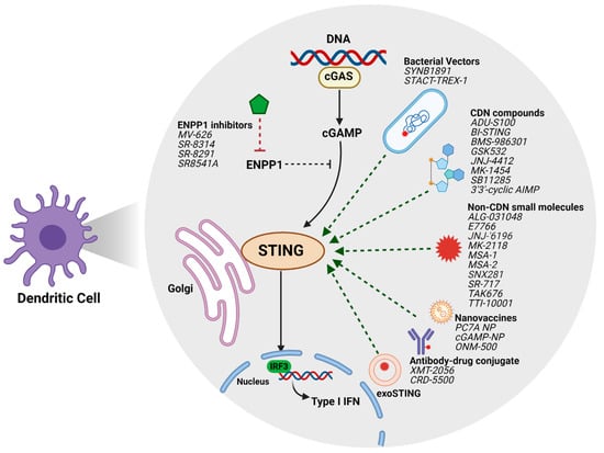 STING is a transmembrane protein localized to the endoplasmic reticulum which functions as an adaptor protein in the cGAS (cyclic GMP-AMP synthase)-STING pathway [14]. cGAS-STING is a cytosolic DNA-sensing pathway that drives activation of type I IFN and other inflammatory cytokines in the host immune response against tumors [15]. Recognition of cytoplasmic tumor-derived DNA by c-GAS generates cGAMPs which are natural ligands of STING protein. The binding of cGAMP to STING induces transformational changes in STING protein, activating a downstream signaling cascade involving TBK1 and IRF-3, which results in the production of type I IFNs [16].