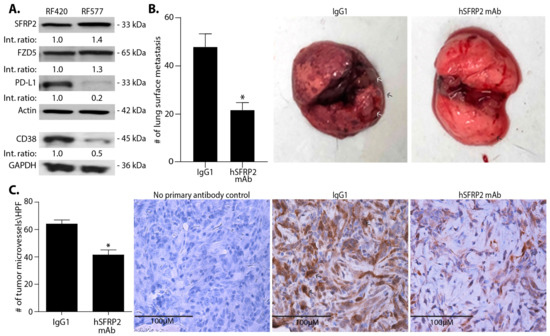 To test the efficacy of SFRP2-targeting immunotherapy on metastatic osteosarcoma, we used two genetically engineered murine cell lines, RF420 and RF577 [17,18]. First, we measured SFRP2, FZD5, CD38 and PD-L1 protein levels by Western blot. Western blot detected SFRP2, FZD5, PD-L1 and CD38 protein in both cell lines. However, while the levels of PD-L1 and CD38 proteins were high in RF420 cells, they were lower in RF577 cells (Figure 1A).