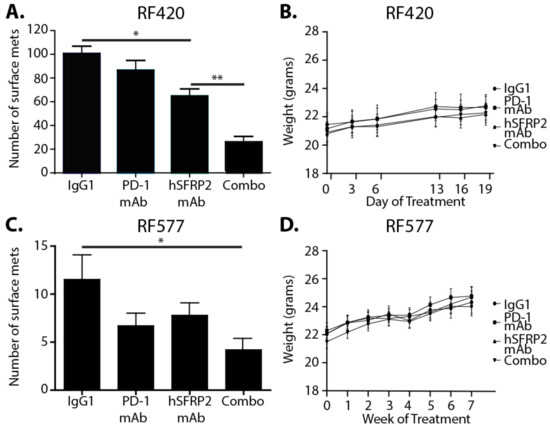 To investigate whether hSFRP2 mAb monotherapy and a combined therapy with mPD-1 mAb would be effective in a second osteosarcoma GEMM model, RF577 OS cells were injected via the tail vein into C57BL/6 male and female mice. Mice were treated either with IgG1 control (n = 14), mPD-1 mAb (n = 15), hSFRP2 mAb (n = 16) or a combination of both immunotherapies (n = 14) for 49 days. Three mice were excluded from analyses (1 IgG1 control mouse was found dead on day 43 of treatment and on autopsy had numerous surface lung metastases; 1 mPD-1 mAb-treated mouse was euthanized on day 32 for labored breathing and had 2 surface metastases, and 1 hSFRP2 mAb-treated mouse was euthanized on day 39 and had 2 surface metastases. These latter two mice had been involved in fights). Of the 56 remaining mice analyzed (13 animals treated with IgG1 control, 14 animals treated with mPD-1 mAb, 15 animals treated with hSFRP2 mAb and 14 treated with combination immunotherapy) on day 49 of treatment, the number of surface metastases was 11.5 ± 2.5 in the IgG1-treated group, 6.7 ± 3 in the mPD-1 mAb-treated group, 7.8 ± 1.3 in the hSFRP2 mAb-treated group and, in the combination therapy group, was 4.2 ± 1.1 (p = 0.018, comparing IgG1 versus combination; Figure 2C). There was no weight loss (Figure 2D), hair loss or lethargy in any of the remaining mice.