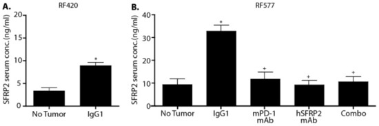 Serum SFRP2 levels are elevated in mice with metastatic osteosarcoma compared to non-tumor-bearing mice and responds to therapy. (A) Serum levels of SFRP2 were compared between C57BL/6 mice with metastatic RF420 OS treated with IgG1 control and non-tumor-bearing C57BL/6 mice with ELISA. There were significantly higher levels of SFRP2 in the serum of mice with metastatic RF420 OS versus mice without tumors (n = 3, * p < 0.01). (B) ELISA was used to compare the serum levels of SFRP2 in all treatment groups of the C57BL/6 mice with metastatic RF577 OS and C57BL/6 mice without tumors. The serum level of SFRP2 was significantly higher in the group of tumor-bearing mice treated with IgG1 compared to non-tumor-bearing mice (* p < 0.01) (n = 9 and n = 8, respectively). The serum level of SFRP2 was significantly decreased in the mPD-1 mAb (n = 8), hSFRP2 mAb (n = 12) and Combo (n = 12) treatment groups compared to IgG1-treated mice (+ p < 0.01).