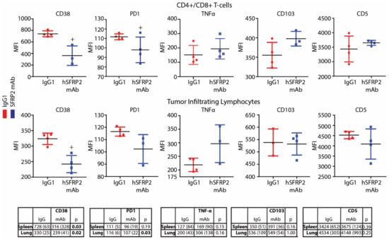 hSFRP2 mAb reduces T-cell CD38 and PD-1 protein in vivo. Splenic CD4+ and CD8+ T-cells (top) and tumor infiltrating lymphocytes (TILs; bottom) isolated from RF420 tumor-bearing mice treated with IgG1 control (red) or hSFRP2 mAb (blue) for 21 days were stained for the following immune markers labeled with fluorochromes: CD38, PD-1, TNF-α, CD103 and CD5. Dot plot graphs show mean fluorescent intensity (MFI) analyzed by FACS for each of the immune markers of interest within the CD4+/CD8+ and TIL populations. For IgG1 and hSFRP2 mAb treatments, the number of independent samples (n) was 4. CD38 was significantly decreased with hSFRP2 mAb in both splenocytes (+ p < 0.05) and TILs (+ p < 0.05). PD-1 was significantly decreased in CD8+ TILs treated with hSFRP2 mAb (+ p < 0.05). Bottom tables: median MFIs (interquartile range) for each immune marker.