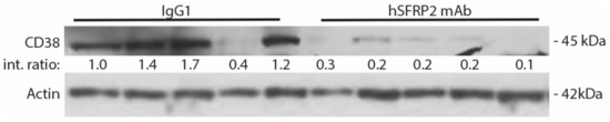 To test if the reduction in CD38 protein levels induced by hSFRP2 mAb treatment occurs in a second cell line in vivo, splenocytes isolated from mice with RF577 OS tumors were subjected to Western blot, probing for CD38. The mean relative CD38 protein levels normalized to actin were reduced in splenocytes from mice treated with hSFRP2 mAb by 82% compared to the control group (p = 0.004, n = 5 per group; Figure 5).