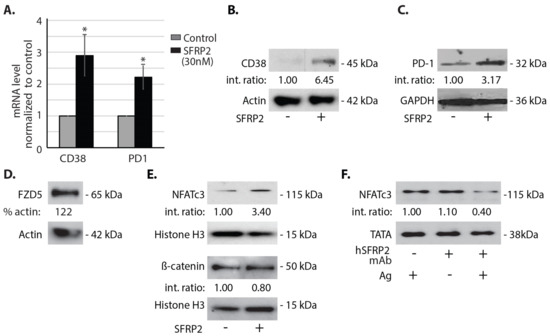 SFRP2 increases CD38 and PD-1 mRNA and protein levels in T-cells. (A) Splenic T-cells cultured in IL2-containing medium were treated with or without SFRP2 (30 nM) for 1 h, and the mRNA levels for CD38 and PD-1 were measured by qRT-PCR (n = 8). GAPDH was used as an internal control. (B–F) All T-cells were treated with IL-2. Samples were probed using Western blot with antibodies to the indicated protein markers. Actin was the loading control for cytoplasmic fraction; histone H3 and TATA were loading controls for nuclear fractions. (B,C,E,F) Int. ratio: intensity ratios listed below Western blots for (B–F) were calculated after normalization to both loading control and reference samples (indicated by 1.00). (B,C) Cytoplasmic fractions of wild-type splenic T-cells were isolated and protein levels of CD38 (B) and PD-1 (C) were increased in SFRP2-treated T-cells, compared to untreated cells. (D) Western blot probing for FZD5 protein in mouse splenic T-cells. % actin: total band intensity was normalized to actin. (E) Splenic T-cells were untreated or treated with recombinant SFRP2 protein for 1 h. The nuclear fraction was isolated from the T-cells, and nuclear NFATc3 and β-catenin protein levels were measured. Nuclear fractions demonstrated increased NFATc3 protein levels but no change in β-catenin levels with SFRP2 treatment. (F) Splenic T-cells were activated with antigen gp100 (0.87 μM) with or without 10 µM of hSFRP2 mAb treatment. Nuclear fractions demonstrated decreased NFATc3 protein levels in hSFRP2 mAb-treated cells activated by antigen.