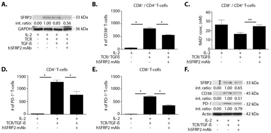 The upregulation of CD38 decreases NAD+, resulting in conditions that promote cancer growth [20]; therefore, we evaluated the effect of hSFRP2 mAb on NAD+. T-cells treated with TCR/TGFβ led to a decrease in NAD+ levels compared to control (control 26.3 ± 5.1 nM, TCR/TGFβ 16.3 ± 1.7 nM (n = 3, p = 0.13)). NAD+ levels were statistically significantly increased by treating T-cells with hSFRP2 mAb (24.7 ± 1.7 nM, n = 3; p = 0.02, Figure 7C). This demonstrates that SFRP2 plays a role in CD38 and NAD+/NADH regulation by TGFβ.