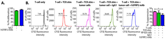 In cancer patients, altered T-cell immune function is blunted by factors tumors secrete in the environment. Several tumor cell lines produce soluble factors that inhibit T-cell proliferation [21]. Thus, whether antagonizing SFRP2 could overcome the tumor-induced inhibition of T-cell proliferation was investigated. First, a direct effect of hSFRP2 mAb on reducing tumor proliferation was evaluated by incubating RF420 osteosarcoma cells with either IgG1 control (10 µM) or hSFRP2 mAb (10 µM) for 72 h (n = 6). There was no difference in tumor cell proliferation between groups (Figure 8A). Next, T-cells were incubated for 72 h either alone, with TCR stimulation, with TCR stimulation + RF420 cells, with TCR stimulation + RF420 cells + IgG1 control (10 µM) or with TCR stimulation + R420 cells + hSFRP2 mAb (10 µM) (n = 3 per group). Compared to the proliferation of quiescent T-cells alone (7.66%), the TCR antigen (positive control) increased the proliferation index to 98.7%. This percentage decreased to 55.7% when TCR-stimulated T-cells were cultured with RF420 cells, confirming the inhibitory effect of tumor cells on T-cell proliferation. The addition of the IgG1 control to the co-culture had no effect (55.6% with IgG1 versus 55.70 without). However, the addition of hSFRP2 mAb in the co-cultures partially rescued T-cell proliferation with an increase to 71.7%. Overall, the percentage of suppression of proliferation decreased significantly from 40.8 ± 1.0% when TCR-stimulated T-cells were incubated with tumor cells, to 31.6 ± 2.16% when hSFRP2 mAb was added to the co-cultures (n = 3; p < 0.05).