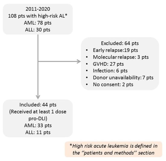 Between 2011 and 2020, one hundred and eight patients who underwent allo-SCT in our department fulfilled the proposed criteria for definition of high-risk acute leukemia and were considered as potential candidates for treatment with pro-DLI. However, 64 out of 108 did not receive pro-DLI due to a variety of reasons, such as development of GVHD, early hematological or molecular relapse, early death, severe infection, donor unavailability or patient refusal to consent. Details are shown in Figure 1.