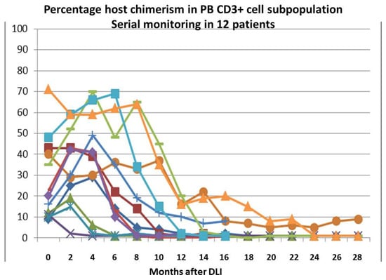 Percentage of host chimerism in peripheral blood CD3+ lymphocytes: Serial monitoring in 12 patients.