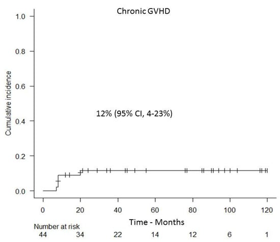 Overall, cGVHD occurred in five out of the 44 patients, with a cumulative incidence of 12% (95% CI, 4–23%) (Figure 3). Onset of cGVHD occurred at a median of three months (range 2–8) after DLI administration. The overall grade of cGVHD was mild in three cases, while it was moderate and severe in one patient each, respectively. Notably, the cumulative incidence of severe cGVHD was extremely low and estimated as 2.3% (95% CI, 2–10%). At the conclusion of the study, four out of five patients were free of active cGVHD and off immunosuppression.