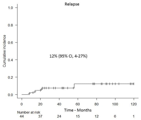 Relapse was observed in only four out of 44 patients after 8-, 14-, 21- and 56-months post-allo-SCT. The cumulative incidence of relapse was 12% (95% CI, 4–27%) (Figure 4). Specifically, relapse occurred in four patients with high-risk AML. Three out of four patients had poor risk cytogenetic features, including complex monosomic karyotype and MLL rearrangement other than t (9; 11). All three patients developed isolated extramedullary relapse. Another patient with t (8; 21) who underwent allo-SCT at a state of refractory disease had a late BM relapse 56-months post-transplant. Of note, this patient developed donor cell leukemia with distinct molecular abnormalities (IDH1-mut and RAS-mut) not present at initial diagnosis. The cumulative incidence of relapse in patients with intermediate and high DRI was 7% (95% CI, 1–27%) and 15% (95% CI, 4–33%), respectively.