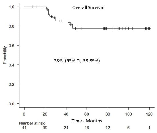 With a median follow-up of 44 months (range 8–120), the RFS and OS were 74% (95% CI, 54–87%) and 78% (95% CI, 58–89%), respectively (Figure 5).