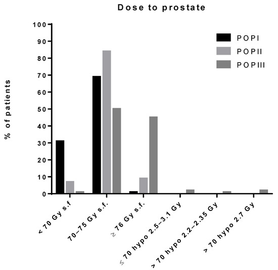 Dose delivered to prostate: POP I (1995–1998), POP II (1999–2003), POP III (2004–2011). Hypo: hypofractionation, s.f.: standard fractionation.