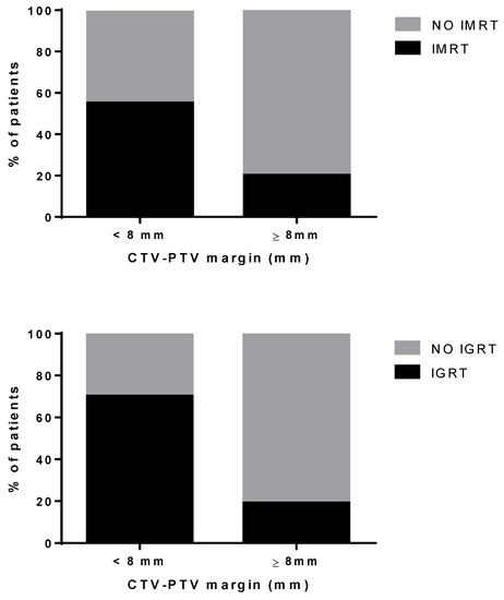 Most patients (70%) were treated with a CTV-PTV margin ≥ 8 mm. A smaller CTV-PTV margin was used when IGRT was given (70% vs. 19%, p < 0.0001); about 50% of the patients treated with the IMRT technique had CTV-PTV margins >8 mm (Figure 2).